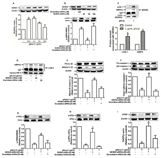 Sestrin2 (SESN2), a member of stress-inducible metabolic proteins, is considered one of the critical regulators of ER stress and AMPK activation [33,39]. To further clarify the upstream signaling mechanisms by which gAcrp suppresses inflammasomes activation in cancer cells, we examined the role of SESN2 signaling. As shown in Figure 4A, gAcrp treatment induced a marked increase in SESN2 protein expression, whereas the mRNA expression level was not significantly affected (Figure S1), indicating that gAcrp upregulates SESN2 expression through a post-transcriptional mechanism. SESN2 knockdown led to prevention of gAcrp-stimulated AMPK phosphorylation in MCF-7 cells (Figure 4B), implying that SESN2 mediates gAcrp-induced AMPK phosphorylation. As SESN2 would not directly phosphorylate AMPK, we assume that SESN2 induction leads to AMPK phosphorylation by an indirect manner. As shown in Figure 4C, gAcrp treatment significantly enhanced complex formation of SESN2/AMPK and SESN2/LKB-1, an upstream kinase of AMPK, as determined by immunoprecipitation using SESN2 antibody. Furthermore, although gAcrp induced a substantial increase in association of LKB1/AMPK, gene silencing of SESN2 almost completely abolished gAcrp-stimulated formation of this complex (Figure 4D). All these results suggest that SESN2 acts as a scaffold for AMPK and LKB-1, which causes subsequent phosphorylation of AMPK. In subsequent experiments verifying the functional role of SESN2 in the modulation of inflammasomes and ER stress by gAcrp, reduction in IL-1β maturation and caspase-1 activation by gAcrp were markedly recovered by gene silencing of SESN2 in MCF-7 cells (Figure 4E,F). Likewise, gene silencing of SESN2 prevented ER stress amelioration by gAcrp, as demonstrated by restoration of the PERK and eIF2α phosphorylation, and CHOP expression (Figure 4G–I). Collectively, these results reveal that SESN2 induction critically contributes to AMPK activation, ER stress homeostasis, and finally suppression of inflammasomes activation in breast cancer cells.
