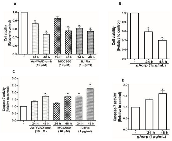 Inflammation, one of the major hallmarks of cancer, mediates cancer progression via the coordinated actions of cytokines, chemokines, and innate immune cells [16]. Inflammasomes, cytosolic multiprotein oligomers containing a member of the NOD-like receptor protein (NLRP) family, the apoptosis-associated speck-like protein containing a CARD (ASC), and pro-caspase-1, are responsible for producing active interleukin family cytokines in response to infection and cellular stress [17]. In addition to the crucial roles in inflammatory and immune responses, emerging evidence has indicated that inflammasomes components are markedly upregulated in various cancers, such as lung, melanoma, oral squamous cell carcinoma, and breast cancer cells [18,19,20,21,22]. In addition, activation of the inflammasome facilitates tumor progression [23,24], suggesting that inflammasomes act as mediators that bridge chronic inflammation and tumorigenesis. Interestingly, in contrast to this notion, it has been also well documented that the suppressive effects on tumor growth by various anticancer agents are mediated through inflammasomes activation, which initiates pyroptotic cell death in cancer cells [25,26,27]. These conflicting reports suggest that the outcome of inflammasomes activation in growth of cancer cells would be specific for cell type, tumor tissue, and the nature of the inducers or inhibitors. Globular adiponectin has recently been shown to inhibit LPS-primed inflammasomes activation via autophagy induction and AMPK signaling in macrophages [28,29]. However, its effect in cancer cells and its implication in the regulation of cancer cell growth have not been explored.