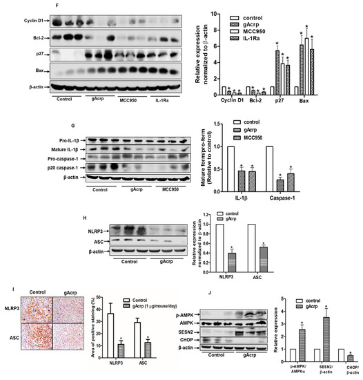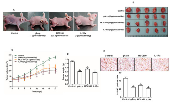 All the animal studies were carried out in accordance with the guidelines of the Yeungnam University Institutional Animal Care and Use Committee (IACUC). The experimental protocols were reviewed and approved by Yeungnam University IACUC (approval date: Apr. 17, 2019 and approval number: 2019-017,). Tumor xenografts were generated by injecting 107 MCF-7 cells mixed with matrigel into the rear flanks of 4 weeks old male BALB/c nude mice (Orient Ltd., Osan, South Korea). After 3 weeks of tumor implantation, mice were randomly allocated into 4 groups (n = 5 in each group) and received one of the following treatments: gAcrp (2 µg/mouse), MCC950 (40 µg/mouse), IL-1Ra (2 µg/mouse), and phosphate-buffered saline (served as control group). All treatments were given by intratumoral administration with a final volume of 50 µL/injection every 48 h. Tumor size was measured twice a week using digital Vernier caliper, and tumor volume (V) was defined as V =(width)2 × length/2. Tumor tissues were then collected after 3 weeks of treatment followed by measuring, weighing, and subjecting to further analysis.