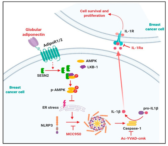 The following are available online at https://www.mdpi.com/2072-6694/12/3/613/s1, Figure S1: Effect of globular adiponectin on SESN2 mRNA expression level in breast cancer cells, Figure S2: Effects of inflammasomes inhibitors on the viability of breast cancer cells, Figure S3: Blots from Western blot analysis.