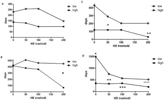 In this study, we analyzed the correlation between EGFR-HS and the progression-free survival (PFS) and overall survival (OS) of patients treated with cetuximab. We used Kaplan–Meyer statistics as well as widely different EGFR-HS threshold ranges (0, 50, 100, 200) to define low/high groups. Our data indicated that in the case of primary tumors with lower than threshold values, EGFR protein expression was associated with longer PFS and OS. However, the differences in relation to OS were statistically significant at the 200 threshold exclusively (p < 0.05) (Figure 3A,B). In the case of metastatic tissues, our data indicated that values lower than the applied threshold of EGFR-HS was associated with significantly longer PFS (at the 50 and 200 thresholds) and OS (at every threshold) and the difference was greatest at the lowest thresholds, gradually decreasing with the increasing EGFR-HS thresholds (Figure 3C,D, Supplementary Table S1).