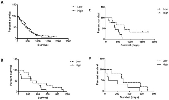 Next, we applied the Cox proportional hazard model to test the predictive power of the EGFR H-score of primary tumors and metastases in a multivariate analysis using well-known factors such as sidedness, involved metastatic organs (single versus multiple), age and sex. This analysis indicated that EGFR H-score is a very weak independent predictor of OS in the case of cetuximab therapy. It approached significance only in the case of metastatic tissue, while sidedness is a much stronger predictor (Table 2 and Table 3). Age also turned out to be an independent predictor, but the corresponding relative risk (RR) levels were minimal. It is known that EGFR protein expression is significantly different in the case of left- versus right-sided cancers [11,19]. Therefore, we conducted a subgroup analysis on the OS of left- and right-sided cases based on EGFR-HS using Kaplan–Meyer statistics. EGFR-HS low- versus high status was determined by the median of the analysed subgroup. In the case of left- or right-sided primary tumors, there was no statistical difference in OS between EGFR-low and EGFR-high tumor cases (Figure 4A,B, respectively). However, a Kaplan–Meyer analysis based on EGFR expression of metastatic tumor tissues demonstrated that at both sides low EGFR-HS patients are characterized by a nominally better median OS (left side low: 766.5 days versus high: 368 days, right side low: 283.5 days versus high: 55 days). This finding was significant only in the case of left-sided tumors (N = 18, p = 0.016), likely due to the low number of right-sided metastatic cases (N = 11, Figure 4C,D, respectively).