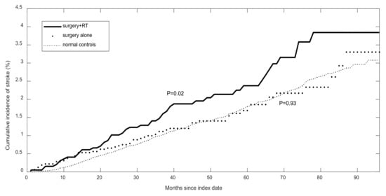 Cumulative incidence rate of ischemic stroke in the oral cavity cancer survivors with two treatment modalities and normal controls.
