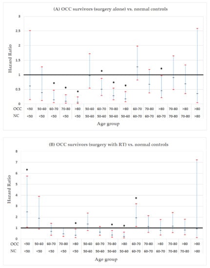 Adjusted hazard ratios with 95% confidence intervals: survivors of oral cavity cancer (OCC) versus normal controls (NC) in different age groups (* p < 0.05, reference group: normal controls). (A) OCC survivors with surgery alone vs. normal controls; (B) OCC survivors with surgery and RT vs. normal controls.