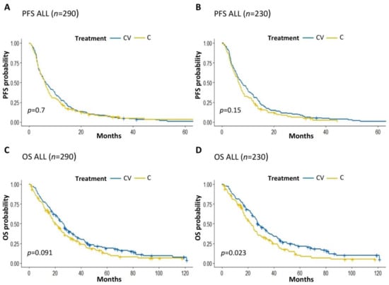 Among HR+ BC patients, those with estrogen receptor (ER)-positive and progesterone receptor (PgR)-positive (ER+ PgR+) disease had significantly longer PFS and OS when treated with CV vs. C (median PFS: 7.28 vs. 5.96 months, p = 0.025; median OS: 27.2 vs. 20.9 months, p = 0.01) (Figure S2A,B), while we found no significant PFS or OS differences among ER+ and PgR-negative (PgR-) BC patients treated with CV vs. C (median PFS: 9.63 vs. 13.08 months, p = 0.53; median OS: 32 vs. 27.7 months, p = 0.87) (Figure S2C,D). There were no patients with ER-negative (ER-) and PgR+ BC in this study.