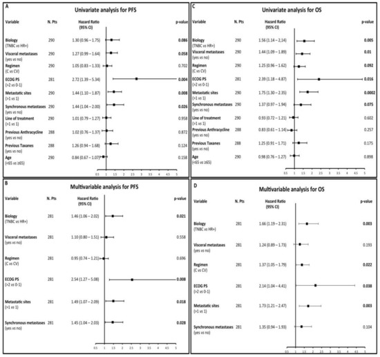 Predictors of worse OS at univariate analysis were: TNBC biology (HR 1.56), the presence of visceral disease (HR 1.44), single-agent ChT (i.e., C vs. CV: HR 1.25), worse ECOG PS (HR 2.39), a higher number of metastatic sites (HR 1.75), the presence synchronous metastases at diagnosis (HR 1.37) (Figure 2C). At multivariable analysis, TNBC biology (HR 1.66), single-agent C (HR 1.37), worse ECOG PS (HR 2.14) and a higher number of metastatic sites (HR 1.73) confirmed their independent association with shorter OS (Figure 2D).
