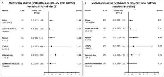 To evaluate the impact of ChT on OS in more homogeneous patient populations, we performed multivariable analysis in a subgroup of 238 patients (119 treated with CV and 119 with C) matched for variables that were independently associated with OS, i.e., TNBC biology, ECOG PS and number of metastatic sites (Criterion a, see Material and Methods). In this population (see Table S1 for clinical/tumor characteristics), covariates independently associated with higher risk of death were: C treatment (HR 1.36), TNBC biology (HR 1.35) and a higher number of metastatic sites (HR 1.96) (Figure 3A). Furthermore, with an HR of 1.63 and 1.3, respectively, single-agent C treatment and TNBC biology were the only factors associated with significantly worse OS in 176 (88 treated with CV and 88 with C) patients matched on the basis of covariates that were unequally distributed in the CV vs. C subgroups (i.e., age, previous anthracycline and taxane treatment: Table S2; Figure 3B).