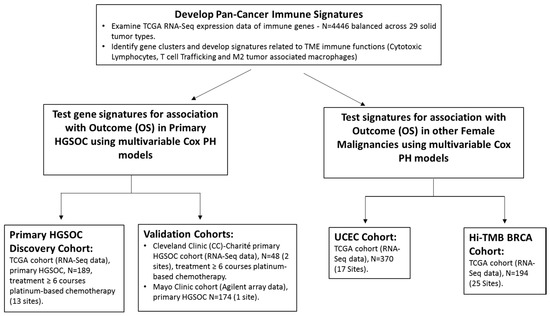 Study design for development of pan cancer immune signature from 29 different solid tumor types in The Cancer Genome Atlas (TCGA) and testing of the immune signatures for relationship to outcome in HGSOC and other female cancers. Patients in all high-grade serous ovarian cancer (HGSOC) cohorts underwent the cytoreductive surgery of a primary tumor followed by adjuvant platinum-based chemotherapy. OS (overall survival); proportional hazards (PH) UCEC (uterine corpus endometrial cancer); breast cancer (BRCA); tumor mutational burden (TMB); overall survival (OS).