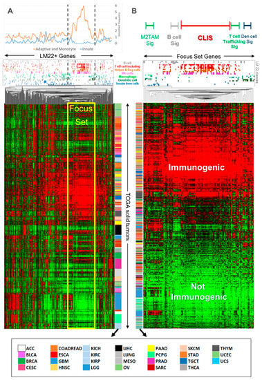 Pan-cancer immunome-clustered heat map of immune-related genes from a stratified uniform sampling of 4446 solid tumor samples. Each tumor specimen is a row and each immunome gene is a column in each heatmap. Each gene is a member of one or more of the immunome 22 classes, where class membership is indicated in the color-coded graph immediately above each heat map. (A) denotes a hierarchical clustering where each gene is centered by column. (B) denotes the re-clustering of TCGA solid tumor samples using the focus set of 126 genes and annotation of the immune signatures of interest. Abbreviations: CLIS, Cytotoxic Lymphocyte Immune Signature; Den, dendritic; Sig, signature; TAM, tumor associated macrophage. A detailed description of each gene class and its color code is provided in Figure S1. An explanation of TCGA codes is provided in Table S1.