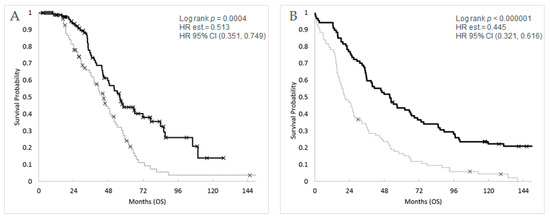 Kaplan–Meier plots of high (solid) vs. low (dotted) values of the T cell trafficking:M2 tumor-associated macrophages—TCT:M2TAM (ratio) signature in tumors from high-grade serous ovarian cancer (HGSOC) patients from (A) TCGA cohort (OS, n = 189) and (B) the Mayo Clinic cohort (OS, n = 174). High vs. low is determined by the median of TCT:M2TAM for the cohort. Censored overall survival (OS) times are represented by an X. HR (hazard ratio) and CI (confidence interval).