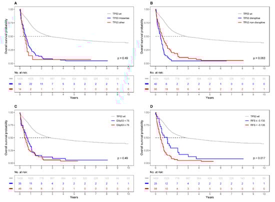 Overall survival (OS) probabilities for patients with TP53-mutated AML according to functional mutation scoring systems. (A) comparison of missense TP53 mutations versus other types of aberration (nonsense and splice site mutations, insertions and deletions). (B) comparison of disruptive versus non-disruptive TP53 mutations. (C) classification according to the “Evolutionary Action p53 Score”. (D) classification based on the “Relative Fitness Score” (RFS) with the AML-specific threshold of −0.135 showing a statistically significant survival difference (median OS, 12.9 versus 5.5 months). All p-values refer to the comparison of TP53-mutated groups. Abbreviation: wt, wild type.