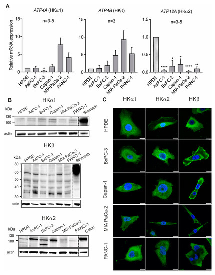 Next, we determined the expression of the H+,K+-ATPases subunits in five different human pancreatic ductal adenocarcinoma cell lines (AsPC-1, BxPC-3, Capan-1, MIA PaCa-2, PANC-1) (Figure 3A–C). The human “normal” pancreatic duct epithelial cell line HPDE was used as an example of non-cancer cell line. Similar to our earlier studies [14,15], we performed quantitative PCR on all cell lines used (Figure 3A). It appears that in the PDAC cells the gastric ATPase subunits (HKα1 and HKβ) expression seemed enhanced in some PDAC cell lines compared to HPDE cells, while the non-gastric ATPase α subunit was more prominent in HPDE cells. Expression was also confirmed on a protein level (Figure 3B). Protein extracts from mouse stomach and colon were used as positive controls for gastric and non-gastric H+, K+-ATPases, respectively. HKα1 and HKα2 are expressed as doublets around 110 kDa. Similar results have previously been shown in the rat pancreas, stomach, kidney and colon [14]. The gastric HKβ subunit is usually a highly glycosylated protein in the mouse stomach. In all cell lines, we detected HKβ bands of various sizes, including the core protein of 35 kDa, variably glycosylated forms and the full-glycosylated form around 60 kDa. Collectively, our expression data from the human PDAC and HPDE cells are in agreement with previously published observations of H+, K+-ATPases expression in human pancreatic ducts and two other PDAC cell lines [15]. We further assessed the cellular localization of the three different subunits by immunocytochemistry in HPDE and PDAC cells. HKα1-, HKα2- and HKβ-subunit fluorescence was detected on or close to the plasma membrane and in the intracellular compartment (Figure 3C).
