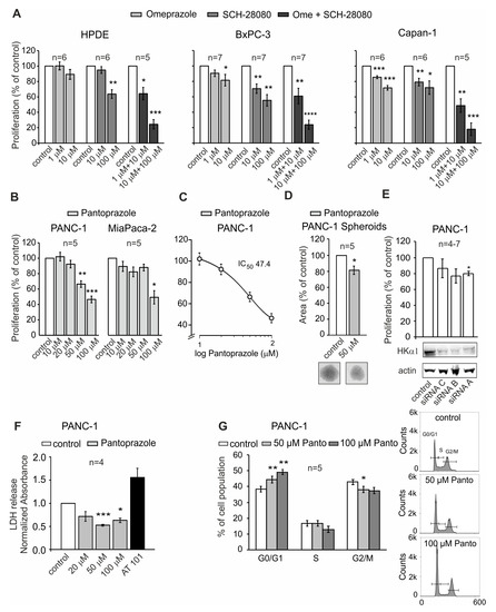 Role of H+, K+-ATPase in PDAC cell proliferation, cell viability and cell cycle. (A) Effect of PPIs and P-CAB on cell proliferation in HPDE (100 µM SCH-28080: ** p = 0.0013; 1 µM Ome+10 µM SCH-28080:* p = 0.0114; 10 µM Ome+100 µM SCH-28080: *** p = 0.0002), BxPC-3 (10 µM Ome: *P= 0.0485; 10 µM SCH-28080: ** p = 0.003; 100 µM SCH-28080: ** p = 0.001; 1 µM Ome+10 µM SCH-28080: ** p = 0.0084; 10 µM Ome+100 µM SCH-28080: **** p < 0.0001) and Capan-1 (1 µM Ome: *** p = 0.0006; 10 µM Ome: *** p = 0.0002; 10 µM SCH-28080: ** p = 0.0083; 100 µM SCH-28080: * p = 0.0233; 1 µM Ome+10 µM SCH-28080: ** p = 0.0042; 10 µM Ome+100 µM SCH-28080: *** p = 0.0006) cell lines; one-sample t-tests. Cells were incubated for 24 h with two different concentrations of omeprazole and SCH-28080, individually and together. (B) The effect of various concentrations of pantoprazole on proliferation of PANC-1 (50 µM:** p = 0.0042; 100 µM:*** p = 0.0008) and MIA PaCa-2 cells (100 µM: * p = 0.0168), one-sample t-tests and p values adjusted for multiple comparisons as more than two different conditions were tested against controls. (C) Dose-response curve for pantoprazole on PANC-1 cell proliferation. (D) Effect of pantoprazole treatment on PANC-1 spheroid sizes (* p = 0.0273 (one-sample t-test)). (E) Effect of three different siRNAs targeted to HKα1 on PANC-1 cell proliferation (* p = 0.012) with respective western blot showing the effectiveness of the siRNAs on HKα1 protein expression. (F) Effect of various concentrations of pantoprazole on LDH (lactate dehydrogenase) release in PANC-1 cells. (50 µM: *** p = 0.0008; 100 µM: * p = 0.012 (adjusted P values, one-sample t-test) (G) Effect of pantoprazole on the different phases of the cell cycle in PANC-1 cells: G0/G1 (** p =0.0087; ** p =0.0013); S (NS); G2/M (* p =0.0113); paired t-test). Peak count analysis is shown in the right panel. Data are shown as means ± s.e.m. from the indicated number of independent experiments.
