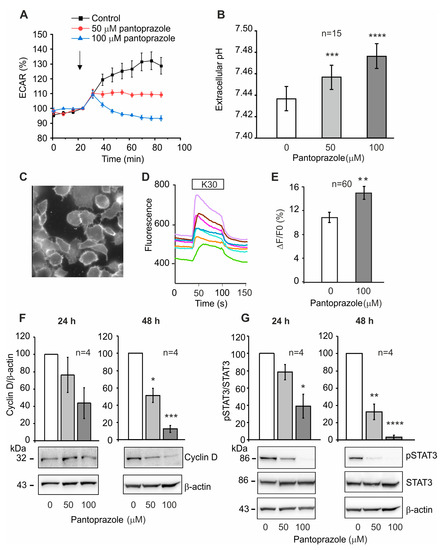 Pantoprazole has fast effects on extracellular pH and membrane potentials in PANC-1 cells. (A) Extracellular acidification rate monitored in Seahorse was normalized just prior to injection of control or pantoprazole solution. Extracellular acidification rate (ECAR) stabilizes within 15–20 min following “disturbance” due to injections. Representative experiment showing mean of 6 replicates ± s.e.m. (B) Readouts of extracellular pH measurements monitored by SNARF fluorescence (at 15 min) in control and pantoprazole treated cells. Pantoprazole increased extracellular pH in chronically and acutely treated cells (merged data for 24 h, 1 h and 15 min treatments). Data are shown as means ± s.e.m. from 15 experiments (50 µM: *** p = 0.0006, and 100 µM: **** p < 0.0001, paired t-tests). (C) Representative image of PANC-1 cells loaded with membrane voltage sensitive fluorophore VF2.1.Cl. (D) Typical response of several cells within one experiment in response to a 30 mM K+ step. (E) Depolarizing effect of K30 in control cells and those pretreated with pantoprazole for 15–20 min. Response in 60 cells in 10 independent experiments (** p = 0.0034 (unpaired t-test)). (F,G) Western blot quantification of cyclin D1 expression (normalized to β-Actin) and p-STAT3 (normalized to total STAT3 level) with representative blots. (F) Effect of pantoprazole on cyclin D1 expression after 24 and 48 h (48 h: 50 µM (*P = 0.0100) and 100 µM (*** p = 0.0002), one-sample t-test) and (G) STAT phosphorylation after 24 h (100 µM: * p = 0.0220) and 48 h treatment (50 µM: ** p = 0.0049 and 100 µM: **** p < 0.0001, one-sample t-test).