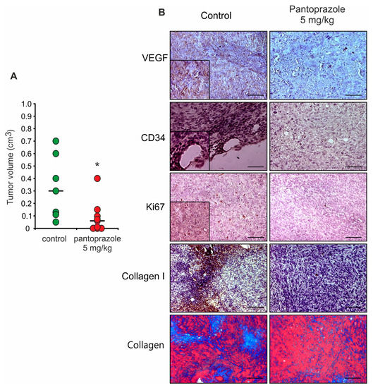 Slides obtained from a paraffin embedded specimen derived from three control mice and four mice treated with pantoprazole have been analyzed by IHC using antibodies against VEGF, CD34 and collagen I to identify the impact of the pantoprazole treatment on neoangiogenesis, and to evaluate tumor fibrosis (Figure 6B). Tissue sections from control mice were all positive for the VEGF, with strong positivity (score = 2–3, Table 1) for two of the three specimens, while mice treated with pantoprazole had tissues with a weak (score = 1) or negative (score = 0) immunostaining, as shown in the representative IHC fields (Figure 6B). Immunostaining for CD34 was moderate (score = 2) in all the control samples analyzed, whereas all specimen derived from mice treated with pantoprazole resulted in an absent or very poor signal (Figure 6B). Moreover, samples derived from pantoprazole-treated mice displayed weak or none Ki67 expression, a marker for proliferating cells, contrasting moderate staining in nuclei in tissue from control mice (Figure 6B). All control samples were positive for collagen I (score = 2), while a few or no positive cells have been detected in samples from pantoprazole treated mice (score = 0; 1). Additionally, Mallory staining showed decreased staining for collagen in specimens from treated animals (Figure 6B).