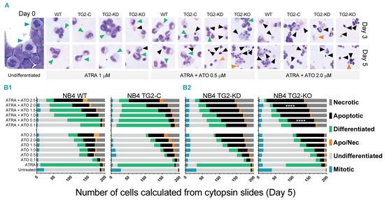 To determine the differentiation stages of NB4 cells, a variety of morphological changes were evaluated for the single and the combined treatments. In the case of ATRA treatment, the cells mainly represent differentiated and mitotic cells (blue and green triangles, Figure 1A). ATRA, ATO 0.5 μM and the combination treatment caused less apoptosis in NB4 WT and NB4 TG2-C (virus control) cells, such as TG2-deficient NB4 TG2-KD and NB4 TG2-KO cells (Figure 1(B1,B2), upper panels, green and black bars). Results showed that at day 5, arsenic trioxide induces a time- and dose-dependent cytotoxic effect on morphology, representing damaged and late apoptotic-necrotic phases. Higher concentrations of ATO were associated with an increased number of apoptotic and necrotic cells (Figure 1(B1,B2), lower panels, green and black bars). While the number of differentiated cells was low in NB4 WT and NB4 TG2-C cell lines, a higher apoptotic rate was seen in the ATRA + ATO 2.0 μM combined treatment compared to the ATRA + ATO 0.5 μM treatment of cells (Figure 1(B2), upper panels). There was a higher degree of apoptosis or necrosis in NB4 TG2-KD or NB4 TG2-KO cells (Figure 1(B2), upper panel, black and dark grey bars). ATO treatment alone resulted in minor differentiation, with ATO concentration-dependent apoptosis in the NB4 cell lines (Figure 1(B1,B2), lower panels).