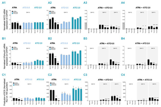 We previously reported that the atypical expression of TG2 greatly enhances neutrophil granulocytes’ production of ROS by enhancing the expression of two important components of the NADPH-oxidase complex, NCF-2/P67PHOX and GP91PHOX. ATO treatment caused significant cellular changes in NB4 cell lines, which may affect the production of ROS. Because the NADPH-oxidase system is responsible for ROS production, we sought to determine the extent of ROS production after ATRA/ATO treatments. Both NCF-2/P67PHOX and GP91PHOX mRNA expression levels were measured at 1 μM ATRA, 0.5 μM, 2.0 μM ATO, respectively, and ATRA + ATO combined treatments at days 0, 3 and 5. While the levels of mRNS expression of both genes showed a similar pattern, especially on the fifth day, displaying a TG2-dependent expression after ATRA treatment, ATO treatments resulted in a magnitude of gene expression almost similar to that of ATRA generated in NB4 WT cells (Figure 2(A1,A2,B1,B2), left side). In combined treatments (ATRA + ATO, 0.5 and 2.0 μM), as a consequence both of the combined treatment and the extent of TG2 quantities, expression values remained low compared to ATRA or ATO treatments alone (Figure 2(A3,A4,B3,B4), right side). These expression values were also reflected in the production of ROS, especially in the ATRA + ATO 2.0 μM treatment, where a 1/3 ROS generating capacity was measured compared to the ROS production with ATRA or ATO treatment alone, depending on the amount of TG2 (Figure 2(C1–C4)).