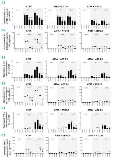 DS, which can be fatal in 2.5–30% of cases in its moderate or severe forms, is characterized by the presence of a large number of inflammatory, differentiated leukemic cells in the bloodstream that synthesize and secrete chemokines and cytokines, triggering a so-called “cytokine storm.” We previously showed that MCP-1, IL-1β and TNFα were secreted in a TG2-quantity-dependent manner in differentiated NB4 cell lines. MCP-1, IL-1β and TNFα were measured at the mRNA and protein levels in ATRA, ATRA + ATO 0.5 μM, and ATRA + ATO 2.0 μM differentiated NB4 WT, NB4 TG2-C, NB4 TG2-KD and NB4 TG2 KO-cell culture systems. Overall, at day 5, mRNA levels of MCP-1, IL-1β and TNFα were approximately 50% lower for the combined ATRA + ATO 2.0 μM treatment than for ATRA, but these values were further reduced in a TG2-quantity-dependent manner (Figure 3(A1,B1,C1)). At day 5, we observed the effective inhibition of MCP-1, IL-1β and TNFα (with 5×, 10× and 20× lower values, respectively, than the controls) in the case of NB4 WT cells in combined therapy, especially ATRA + ATO 2.0 µM, with respect to proinflammatory cytokines and the chemokine content of cell culture supernatants. These values were further reduced in a TG2-quantity-dependent manner (Figure 3(A2,B2,C2), Table S1).
