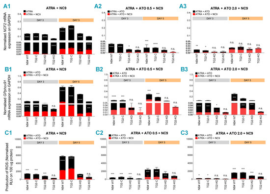 NC9 is an irreversible TG2 inhibitor, and ATO-induced differentiation is a TG2-independent process. In cell lines where TG2 was induced by ATRA, significantly lower expression levels of both NCF-2/P67PHOX and GP91PHOX mRNA were measured in the presence of NC9, compared to the controls (Figure 4(A1–A3,B1–B3), red bars, black bars as control). For NCF-2/P67PHOX, the measured values were less than those measured for ATRA in the presence of TG2 inhibitor NC9 (Figure 4(A1–A3)). In ATRA + ATO-treated cells (0.5 and 2.0 μM), TG2 inhibitor NC9 significantly reduced ROS production at day 5 in an ATO concentration-dependent manner (Figure 4(C1–C3)). The ROS production of differentiated NB4 WT cells was decreased 2.4- and 3.5-fold by 0.5 μM and 2.0 μM ATO, respectively. The TG2 inhibitor NC9 further reduced these values to 2.5 times for the ATRA, 10 times for the ATRA + ATO 0.5 µM and 28 times for the ATRA + ATO 2.0 µM treatments (Figure 4(C1–C3)).
