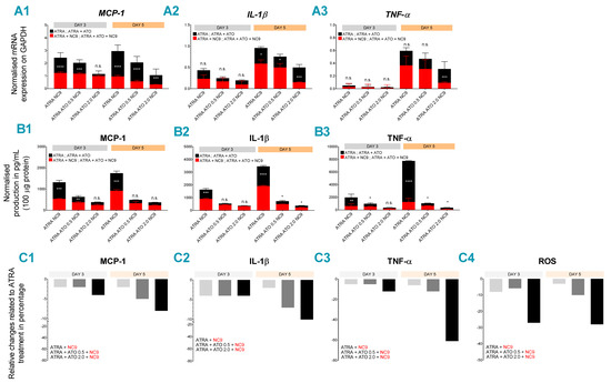 Compared to ATRA treatment, combining ATRA with ATO reduced both mRNA expression and the concentration of secreted MCP-1, IL-1β and TNF-α in a time-dependent manner (Figure 3(A2,B2,C2)). The decreases directly correlated with both TG2 expression and ATO concentration. The NC9 TG2 inhibitor significantly reduced the mRNA levels of NCF-2/P67PHOX, GP91PHOX, MCP-1, IL-1β and TNF-α and also reduced the production of ROS and secreted levels of MCP-1, IL-1β and TNFα (Figure 4(A1–A3,B1–B3,C1–C3); Figure 5(A1–A3,B1–B3), red bars). The amount of secreted proteins was reduced significantly (to a 7- to 60-fold decrease) after the combined ATRA + ATO treatment compared to the ATRA treatment alone (Table S1).