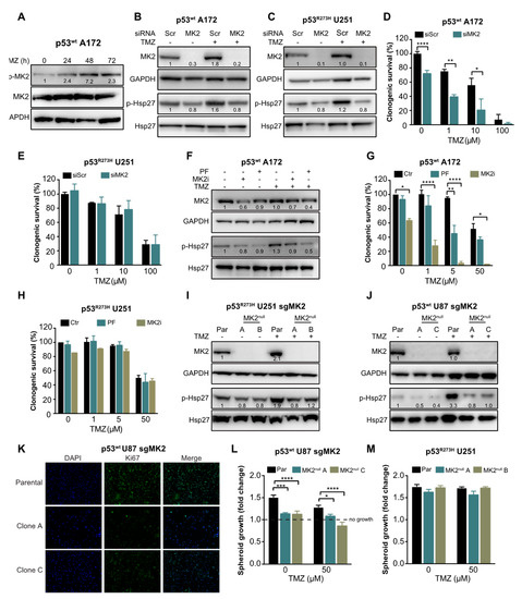 MK2 inhibition attenuates proliferation of p53wt glioblastoma cells. (A) Cells were treated with temozolomide (50 µM) for 0–72 hr and lysates immunoblotted against indicated antibodies. (B,C) Scramble (Scr) or MK2 siRNA transfected cells were treated with temozolomide (TMZ, 50 µM, 48 hr) and lysates immunoblotted against indicated antibodies. (D,E) Scramble or MK2 siRNA transfected cells were treated with temozolomide and colonies quantified after 12 days of treatment. (F) Cells were treated with PF-3644022 (PF, 3 µM), MK2 inhibitor IV (MK2i, 1.5 µM) and temozolomide (50 µM, 48 hr) and lysates immunoblotted against indicated antibodies. (G,H) Cells were treated with PF-3644022 (3 µM), MK2i (1.5 µM) and temozolomide and colonies quantified after 12 days of treatment. (I,J) Parental (Par) and MK2null cells were treated with temozolomide (50 µM, 48 hr) and lysates immunoblotted against indicated antibodies. (K) Parental and MK2null cells were stained with Ki67 antibody and DAPI. (L,M) Parental and MK2null spheroids were treated with temozolomide and growth calculated as the spheroid size on Day 16 over Day 2 (treatment day). All immunoblot images and band intensities are representatives of 3-4 independent experiments. Bar graphs for clonogenic and spheroid growth assays represent mean ± SEM from 3 independent experiments performed in duplicate (* p < 0.05; ** p < 0.01; *** p < 0.001; **** p < 0.0001; one-way ANOVA followed by Bonferroni’s post-test for multiple comparison). Immunofluorescence images are representatives of 3 independent experiments.