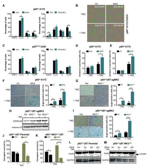 MK2 inhibition induces senescence and apoptosis in p53wt glioblastoma cells. (A) Scramble (Scr) or MK2 siRNA transfected cells were treated with temozolomide (TMZ, 50 µM, 72 hr) and PI staining analyzed by flow cytometry. (B) Cells were treated with MK2 inhibitor IV (MK2i, 1.5 µM) and temozolomide (10 µM, 96 hr) and quantification of G0/G1 (red cells) was performed with IncuCyte S3. (C) Scramble or MK2 siRNA transfected cells were treated with temozolomide (50 µM, 72 hr) and PI staining analyzed by flow cytometry. (D) Scramble or MK2 siRNA transfected cells were treated with temozolomide (25 µM, 10 days) and Annexin-V staining analyzed by flow cytometry. (E) Cells were treated with MK2 inhibitor IV (1.5 µM) and temozolomide (25 µM, 10 days) and Annexin-V staining analyzed by flow cytometry. (F) A172 cells were treated with MK2 inhibitor IV (1.5 µM) and temozolomide (25 µM, 10 days) and stained for β-galactosidase (β-gal). (G) U87 Parental (Par) and MK2null (clone C) cells were treated with temozolomide (25 µM, 10 days) and stained for β-galactosidase. (H) Parental and MK2null (clone C) cells were treated with temozolomide (25 µM, 10 days) and lysates immunoblotted against indicated antibodies. (I) Parental and MK2null (clone C) cells were treated with temozolomide (25 µM, 20 days) and stained for β-galactosidase. (J,K) Parental and MK2null (clone C) cells were transfected with scramble or p53 siRNA, treated with temozolomide (25 µM) and colonies quantified after 12 days of treatment. (L,M) Parental and MK2null (clone C) cells were transfected with scramble or p53 siRNA, treated with temozolomide (25 µM, 7 days) and lysates immunoblotted against indicated antibodies. All immunoblot including band intensities and microscopic images are representatives of 3 independent experiments. Bar graphs represent mean ± SEM from 3 independent experiments (* p < 0.05; ** p < 0.01; *** p < 0.001; **** p < 0.0001; paired t-test).
