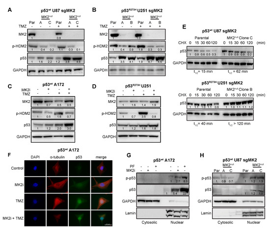 The following are available online at https://www.mdpi.com/2072-6694/12/3/654/s1, Figure S1: MAPKAPK-2 (MK2) expression in glioma databases. Figure S2. Schematic overview of the CRISPR-Cas9 gene editing to knock-out MK2 in glioblastoma cells. Figure S3. Analysis of DNA damage upon MK2 inhibition. Figure S4–S8. Whole uncropped blot images and quantification of 3-4 independent experiments for all figures containing immunoblots. Figure S9. DNA sequencing data to confirm p53 R273H mutation in U251 cells.