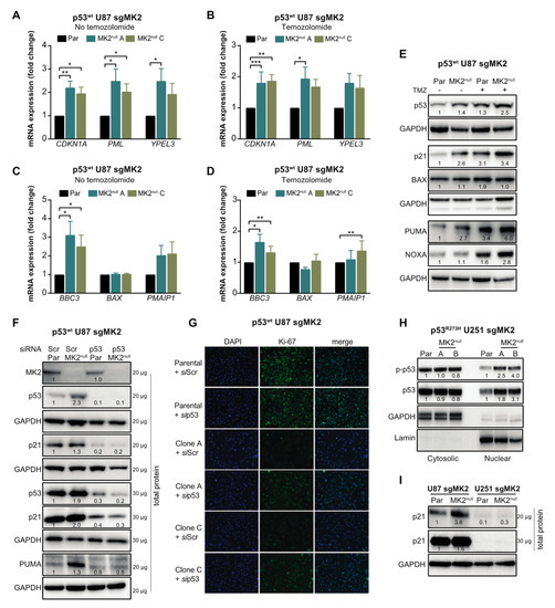 p53wt silencing rescues the anti-proliferative efficacy of MK2 inhibition. (A–D) Parental (Par) cells and MK2null clones were treated with temozolomide (TMZ, 50 µM, 48 hr) and nuclear extracts analyzed by qRT-PCR for senescence (A,B) and apoptosis (C,D) genes. Bar graphs represent mean ± SEM from 3 independent experiments (* p < 0.05; ** p < 0.01; *** p < 0.001; paired t-test). (E) Parental and MK2null (clone A) cells were treated with temozolomide (50 µM, 48 hr) and lysates immunoblotted against indicated antibodies. (F) Parental and MK2null (clone A) cells were transfected with scramble (Scr) or p53 siRNA for 72 hr, and lysates immunoblotted against indicated antibodies. (G) Parental and MK2null (clones A and C) cells were transfected with scramble or p53 siRNA for 72 hr. Fixed cells were stained with Ki67 antibody and DAPI. (H) Cytosolic and nuclear extracts of parental and MK2null (clones A and B) cells were immunoblotted against indicated antibodies. (I) Lysates of parental and MK2null (clone A for U87; clone A for U251) cells were immunoblotted against indicated antibodies. All immunoblots including band intensities and immunofluorescence images are representatives of 3 independent experiments.
