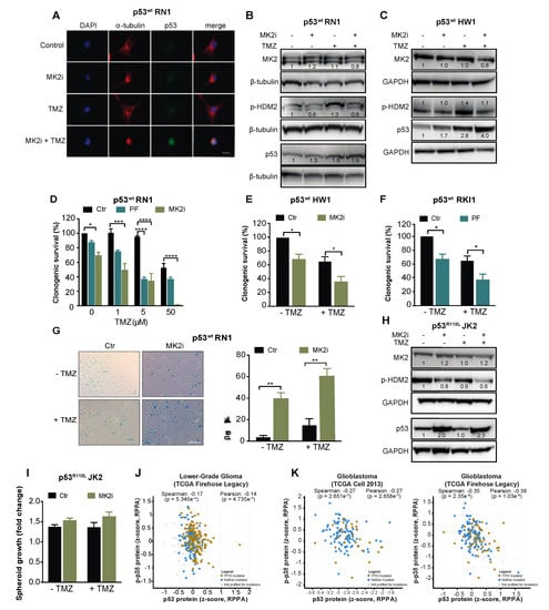 MK2 inhibitors attenuate proliferation of p53wt glioblastoma stem-like cells. (A) Cells were treated with MK2 inhibitor IV (MK2i, 1.5 µM) and temozolomide (TMZ, 50 µM) for 48 hr and fixed cells stained with indicated antibodies and DAPI. (B,C) Cells were treated with MK2i (1.5 µM) and temozolomide (50 µM) for 48 h and lysates immunoblotted against indicated antibodies. (D–F) Cells were treated with MK2 inhibitor IV (1.5 µM), PF-3644022 (PF, 3 µM) and temozolomide for 12 days and colonies quantified using ImageJ. (G) Cells were treated with MK2 inhibitor IV (1.5 µM) and temozolomide (25 µM) for 10 days and stained for β-galactosidase (β-gal). (H) JK2 cells were treated with MK2 inhibitor IV (1.5 µM) and temozolomide (50 µM) for 48 h and lysates immunoblotted against indicated antibodies. (I) JK2 spheroids were treated with temozolomide and growth calculated as the spheroid size on Day 16 over Day 2 (treatment day). (J,K) Correlations of p-p38 MAPK and p53 protein expression in the TCGA cohorts of lower-grade glioma (n = 435) and glioblastoma (n = 214 for Cell 2013, n = 244 for Firehose Legacy; cbioportal.org). All immunoblot, immunofluorescence and microscopic images are representatives of 3 independent experiments. Bar graphs for clonogenic and spheroid growth assays are mean ± SEM from 3 independent experiments performed in duplicate (* p < 0.05; ** p < 0.01; **** p < 0.0001; one-way ANOVA followed by Bonferroni’s posttest for multiple comparison in D and paired t-test in E,F,G).