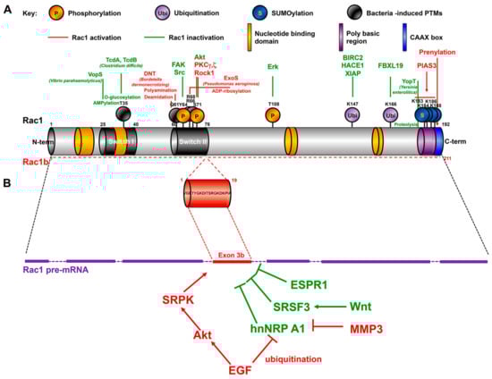 Primary structure of Rac1 and Rac1b splice variant. (A) Posttranslational modifications (PTMs) of Rac1. In green are represented PTMs that inactivates Rac1, in Red those that stimulates the GTPase signaling. (B) Regulation of Rac1 splicing. For details see the text.
