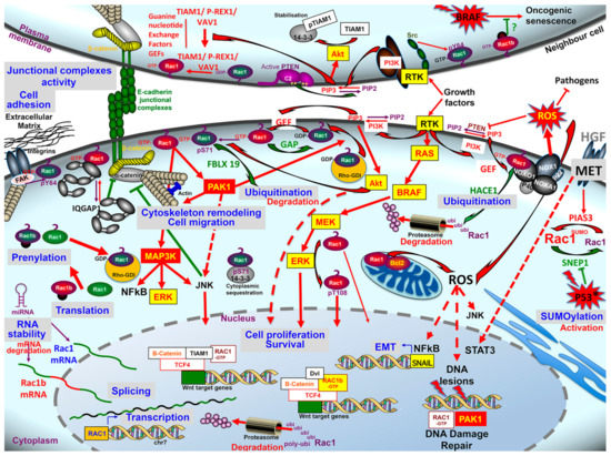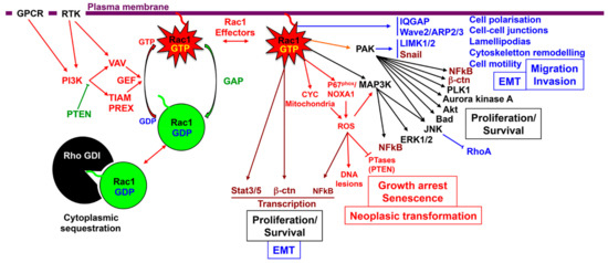 Rac1 initiates several signaling pathways, -including PAKs, NOX1 complex/reactive oxygen species (ROS) production, NFkB, members of MAPKs, Wnt/β-catenin/TCF, STAT3-, regulating membrane ruffling, cytoskeletal remodeling, cell adhesion, cell–cell contacts, cell polarity, cell motility, and transcriptional activity, leading to cell proliferation, epithelial mesenchymal transition (EMT), and invasiveness (Figure 2). Thus, this GTPase might be involved at different steps of the neoplastic progression from dysplasia to the metastatic cascade.