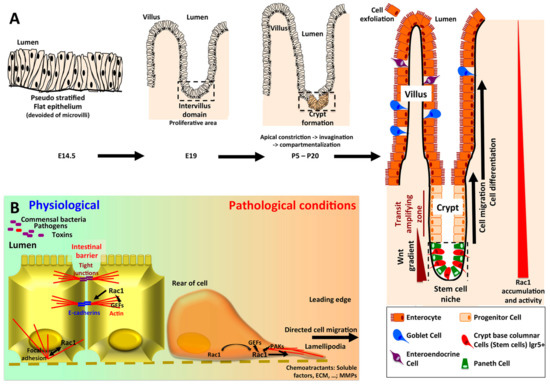 (A) Ontogeny of the crypt-villus unit. The intestinal epithelium originates from endoderm, whereas the underlying mesenchymal and muscular layers derive from mesoderm. Intestinal ontogenesis follows an anteroposterior axis. In mouse, at embryonic day 14.5, the intestinal epithelium is pseudostratified and subjected to an active proliferation. By embryonic day 18, the villi have emerged in the duodenum and the proliferative area is restricted to the intervillus domain [64]. The crypts began to invaginate by day 5 post partum. First, myosin II-mediated apical constriction allows invagination of the crypt progenitor cells. Subsequently, a hinge region forms between crypts and villi. This process requires Rac1, which locally acts to suppress hemidesmosomal integrins, allowing cell shape changes and the formation of the hinge cells, leading to the compartmentalization of the crypt and villi [50]. In adult intestine, the stem cells -colocalized with Paneth cells in the bottom of the crypt- give rise to progenitor cells which will mainly differentiate into enterocytes, but also in goblet and enteroendocrine cells, and migrate along the villi to exfoliate at the top, whereas downward cell migration and differentiation allows to renew Paneth cells pool [65]. Wnt3 produced by Paneth cells, as well as EGF and Notch stimuli are required for the maintenance of stem cells. In the crypt villus unit, Rac1 expression and activity follow an increasing gradient from the top of the villi to the bottom of the crypts. As regards the colonic epithelium, the main characteristics rely on the absence of villi (flat mucosa), the absence of Paneth cell (substituted by Reg4+ deep crypt secretory cells), and the main type of differentiation being goblet cells [65]. (B) Rac1 in intestinal homeostasis and intestinal barrier repairs. By initiating the formation of E-cadherin complexes, Rac1 plays a critical role in the maintenance of tissue integrity. Upon wound formation, Rac1 localized to the leading edge of the cells, trigger lamellipodia formation through actin cystoskeleton remodeling, and directed cell migration.