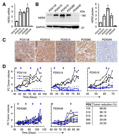 Effect of T-DM1 on the growth of breast cancer PDXs with different HER2 expression levels. (A) Relative HER2 mRNA expression was determined by RT-PCR in a collection of breast cancer PDXs. Data were normalized to GAPDH mRNA. Averages and standard deviation of two independent determinations are represented; (B) Lysates from the same PDXs were analyzed by Western blot with the indicated antibodies (left panel) and densitometrical quantification was performed (right panel). Quantitative results are expressed as averages ± standard deviations of three independent experiments; (C) Immunohistochemical analysis of the expression of HER2 in the same PDXs; (D) NOD/SCID mice carrying the indicated PDXs were treated with vehicle or T-DM1 as indicated (blue arrows). Tumor volume was determined and expressed as fold-change relative to the initiation of treatment. Tumor reduction was calculated at the end of the experiment as the percentage of the average tumor volumes of the tumors treated with T-DM1 relative to tumors treated with vehicle. * p < 0.05, two-tailed Student t test.