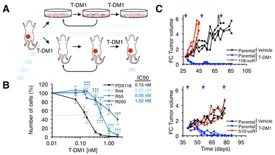 To generate models of acquired resistance, we used in vitro and in vivo approaches (Figure 2A). The in vitro models allow molecular characterization of the mechanisms of resistance while, arguably, in vivo models are closer to real tumors. Cells derived from PDX118 were chronically treated with T-DM1, in vitro, as described in [23] (Figure 2A). As a result, we obtained different resistant cells (R44, R55 and R200) that, compared to parental cells, showed significantly higher IC50s for T-DM1 (Figure 2B).
