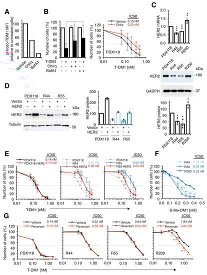 Characterization of in vitro resistant cells. (A) Cultures from PDX118 treated with vehicle, Chloroquine (Chlrq) or Bafilomycin A (BafA1) were stained with pHrodo-T-DM1 for 24 hours at 37 °C and analyzed by FACS. Results are expressed as a percentage of red-positive cells; (B) Left, Cell cultures derived from PDX118 treated with vehicle (-), Chloroquine or Bafilomycin A and T-DM1 as indicated were quantified by crystal violet staining and expressed as percentages relative to cells treated with vehicle. Results are averages and standard deviation of four independent experiments. * p < 0.05, two-tailed Student t test. Right, The same cells were treated with vehicle or Chloroquine and with increasing concentrations of T-DM1. Cell numbers were estimated by crystal violet staining. Results are averages and standard deviation of five independent experiments. *p < 0.05, two-tailed Student t test; (C) Left, Relative HER2 mRNA expression was determined by RT-PCR. Data were normalized to GAPDH mRNA. Averages and standard deviation of four independent determinations are represented. ** p < 0.01, *** p < 0.001, two-tailed Student’s t-test. Middle, Right, Lysates were analyzed by Western blot with the indicated antibodies and densitometrical quantification was performed. Quantitative results are expressed as averages ± standard deviations of three independent experiments; (D) Lysates of cells from PDX118, resistant cells or the same cells transduced with a retroviral vector encoding HER2 were analyzed by Western blot with the indicated antibodies and densitometrical quantification was performed. Quantitative results are expressed as averages ± standard deviations of two independent experiments; (E) The indicated cell cultures treated with increasing concentrations of T-DM1 for 6 days. Cell numbers were estimated by crystal violet staining. Dashed grey line indicates 50% survival and IC50 is shown next to figure legend. Averages and standard deviation of two independent experiments are represented. * p < 0.01, two-tailed Student’s t-test; (F) The indicated cells were treated with increasing concentrations of S-Me-DM1. Cell numbers were estimated by crystal violet staining. Results are averages and standard deviation of five independent experiments. * p < 0.05, ** p < 0.01, *** p < 0.001, two-tailed Student t test; (G) The indicated cell cultures were treated with vehicle or Reversan and with increasing concentrations of T-DM1. Cell numbers were estimated by crystal violet staining. Results are averages and standard deviation of five independent experiments. *p < 0.05, two-tailed Student t-test.