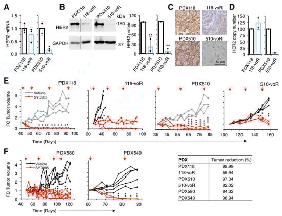 Characterization of in vivo resistant models and effect of SYD985. (A) Relative HER2 mRNA expression was determined by qRT-PCR. Data were normalized to GAPDH mRNA. Averages and standard deviation of three independent determinations are represented; (B) Lysates were analyzed by Western blot with the indicated antibodies (left panel) and densitometrical quantification was performed (right panel). Quantitative results are expressed as averages ± standard deviations of three independent experiments. ** p < 0.01, two-tailed Student’s t-test; (C) Immunohistochemical analysis of the expression of HER2; (D) HER2 gene copy number determination by qPCR; (E, F), NOD/SCID mice carrying the indicated PDXs were treated with vehicle or SYD985 as indicated. Tumor volume was determined and expressed as fold-change relative to the initiation of treatment. Note that the volumes corresponding to PDX118 and PDX510, depicted in gray, treated with vehicle are the same as those shown in Figure 1D. In order to minimize the number of mice used, treatments with T-DM1 and SYD985 were done in the same experiment, although they are presented in different figures. Tumor reduction was calculated at the end of the experiment as the percentage of the average tumor volumes of the tumors treated with SYD985 relative to tumors treated with vehicle. * p < 0.05, ** p < 0.01, *** p < 0.001 two-tailed Student’s t-test.