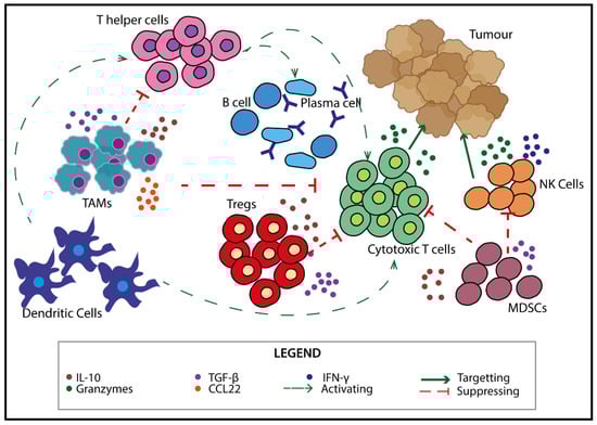 Immune cells in the tumour microenvironment (TME). There are multiple types of immune cells in the TME including dendritic cells (DCs), natural killer (NK) cells, myeloid-derived suppressor cells (MDSCs), tumour-associated macrophages (TAMs) and lymphocytes (B cells and T cells) which can impact the functions of one another. DCs interact with both T helper (Th) and cytotoxic T cells (CTLs) by activating them. The cells themselves can further interact with CTLs and B cells to boost activation. CTLs and NK cells directly act to kill tumour cells via the release of granzymes [47,48]. Pro-tumour cells such as regulatory T cells (Tregs), MDSCs and TAMs secrete immunosuppressive cytokines such as TGF-β and IL-10 which can inhibit CTLs and NK cell functions [49,50,51,52,53].