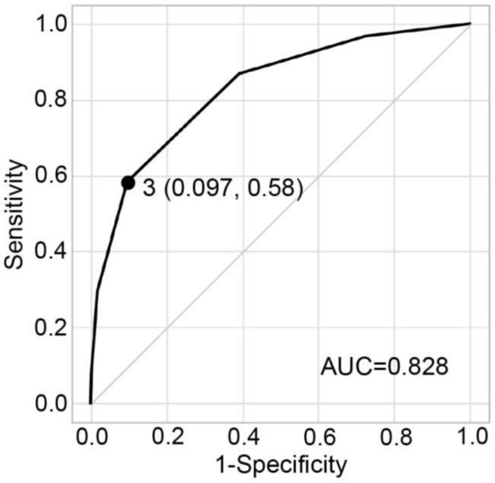ROC analysis for the appropriate threshold of applicable number of predictive factors. The presence of three or more predictive factors was an appropriate threshold with Youden’s index of 0.49, corresponding to a sensitivity of 0.58 and 1-specificity of 0.097. ROC: receiver operative characteristic.