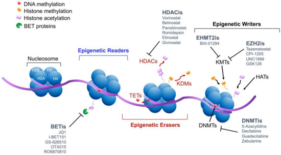 The best-characterized epigenetic modification is DNA methylation, which occurs on the 5-Carbon on cytosine residues of the CpG dinucleotides. These nucleotides are specifically localized in GpC high-content stretches defined as CpG islands, usually found in the proximity of gene regulatory regions (either promoters or enhancers) [15]. The methylation reaction is catalyzed by a group of enzymes, the DNA methyltransferares (DNMTs), also defined as “Writers”. There are three different isoforms of DNMT enzymes that show different and non-redundant roles: DNTM1 is critical to maintaining the proper DNA methylation during mitosis, whereas DNMT3A and DNMT3B are more implicated in the methylation process during embryogenesis [16]. Globally, the readout of the DNMTs activity is the hypermethylation of DNA, which is usually associated with the silencing of gene expression [17,18,19]. Aberrant DNMT levels has been detected in many different cancer types through genome-wide analyses, which highlighted a ~5–10% increased methylation on CpG islands in cancer specimens compared to normal counterparts, with a consequent silencing of several tumor-suppressor genes (i.e., CDKN2B, RASSF1A, GATA4, CDH1), further supporting the tight correlation between epigenetics abnormalities and cancer initiation and progression [20,21,22,23,24].