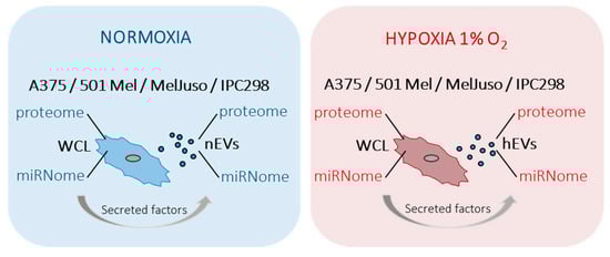 In order to get insights into the various molecular messengers operating in a hypoxic microenvironment in melanoma, the proteomes and miRNomes of whole cell lysates (WCLs) and EVs isolated from supernatants of cells cultured under normoxia or hypoxia, were investigated (Figure 1). Including miRNAs in this study further allowed us to determine the possible influence of post-transcriptional gene regulation ultimately resulting in altered protein levels inside the cell as well as in secreted vesicles. The content of EVs is known to reflect the cell of origin and can partake in intercellular communication. Thus, EVs shuttle different signals between cells grown under different conditions [13].