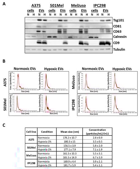 Characterisation of normoxic (N) and hypoxic (H) melanoma small extracellular vesicles (EVs) and whole cell lysates (cells). (A) Western blot of A375, 501Mel, MelJuso and IPC298 cells and EVs under normoxia or hypoxia, probed with antibodies against the EV markers Tsg101, CD81, CD63, CD9 and the endoplasmic reticulum marker Calnexin, as well as Tubulin. (B) Nanosight measurements of EVs from A375, MelJuso, 501Mel, IPC298 cells. (C) Size and concentration of EVs secreted under normoxia or hypoxia for the four melanoma cell lines as measured by Nanosight. Three biological replicates were used for each condition.
