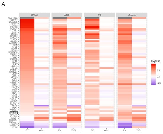 An enrichment of proteins involved in the GO biological processes “RNA splicing” and “regulation of mRNA splicing via spliceosome” was also present for the top differentially expressed proteins in hEVs of 501Mel and IPC298 cells. A recent study has shown that the transfer of splicing factors through EV transfer promotes malignancy of glioblastoma cells [64]. In addition, splicing factors are also present in EVs derived from apoptosis-resistant leukaemia cells [65] and derived from RAS transformed cells [66]. RNA Binding Motif Protein X-Linked (RBMX) and Heterogeneous Nuclear Ribonucleoprotein L (HNRNPL) belong to the GO biological process “RNA splicing” and were enriched in hEVs (RBMX: hEVs IPC298; HNRNPL: hEVs 501Mel, hEVs IPC298). lncRNAs containing RBMX binding motifs were enriched in prostate EVs and those lncRNAs could also influence the miRNA loading in EVs by acting as miRNAs sponges [67]. This could partially explain why the miRNA content in hEVs is different to the miRNA content in nEVs.