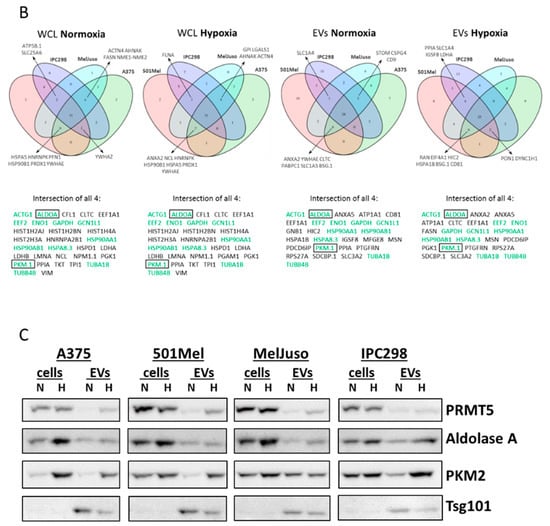 Proteomic analysis of nEVs and hEVs, normoxic and hypoxic whole cells lysates (WCLs) of melanoma cells. (A) Heatmap showing the proteins differentially expressed between normoxia and hypoxia in at least two cell lines, either in EVs or in WCLs, and not imputed in this compartment (either EVs or WCLs). Using these criteria, 49 proteins were identified in EVs, and 14 proteins were identified in WCL. Colour shows normalised expression. Three biological replicates were used for the melanoma cell lines (A375, 501Mel, IPC298), and only two biological replicates for the melanoma cell line MelJuso due to technical problems. (B) Venn diagrams showing the intersections of the top 50 expressed proteins for the four melanoma cell lines in WCL or EV under normoxia or hypoxia. The common proteins for the four melanoma cell lines are indicated below the Venn diagrams. Common proteins for all groups are written in green. Black boxes indicate proteins further validated by Western blot. (C) Expression analysis of ALDOA, PKM2, PRMT5, Tsg101 (EV marker) in normoxic or hypoxic WCL and nEVs or hEVs of four melanoma cell lines (A375, MelJuso, IPC298, 501Mel) by Western blot.