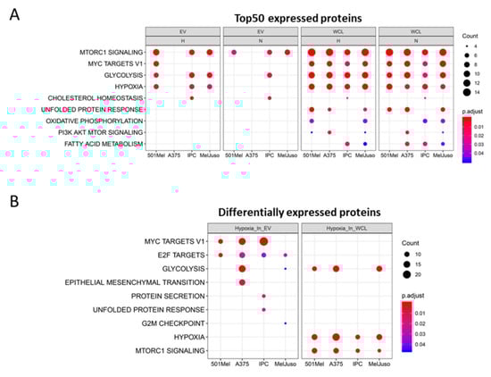 To get insights into the signalling pathways and biological processes related to the top 50 proteins of each compartment (WCL or EV), we performed a functional enrichment analysis using hallmark gene sets (Figure 4) and Gene Ontology (GO) “Biological Processes” (Figure S6) on top expressed proteins. A hallmark is a refined gene set characterised by overlapping gene sets, which have common biological themes [15]. We used hallmark gene set analysis as it has fewer overlapping gene sets and thus, it has less redundancy in the results compared to the GO “Biological Process” analysis. Interestingly, the hallmark “MTORC1 signalling” was enriched in almost all conditions (except in A375 EVs), while the hallmark “hypoxia” was enriched in most of the hypoxic conditions, but strikingly also for all WCLs under normoxia (Figure 4A). Proteins of the “unfolded protein response” (UPR) were exclusively found inside the cells but not in EVs, indicating that the proteins of UPR are not exported to EVs. However, nEVs from bladder cancer cells can induce UPR of non-malignant cells and hEVs can transfer miRNAs potentially triggering UPR [16,17]. Moreover, the GO term “viral life cycle” was strongly enriched within the top expressed proteins in EVs (Figure S6A), suggesting a link to the common origin of EVs and viruses. Many viral envelopes are formed using the endosomal system, which is also the origin of EVs, hence the similar protein contents (e.g., ANXA2, CD81) [18]. When taking differentially expressed proteins under hypoxia into account, the enrichment analysis highlighted “Myc targets” and “E2F targets” in most hEVs (Figure 4B). In WCLs, the hallmarks “hypoxia” and “mTORC1 signalling” were enriched under hypoxic conditions, confirming the involvement of the mTOR signalling pathway in responses to lower oxygen levels [19]. Several biological processes related to RNA metabolism were enriched in the hypoxic EV fraction, suggesting that proteins involved in RNA metabolism are shuttled out of the cell when oxygen drops while “amino acid metabolism” and “response to oxygen level” was confined to WCL (Figure S6B).