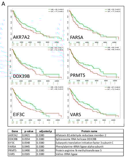 - Aguirre-Gamboa, R.; Gomez-Rueda, H.; Martínez-Ledesma, E.; Martínez-Torteya, A.; Chacolla-Huaringa, R.; Rodriguez-Barrientos, A.; Tamez-Peña, J.G.; Treviño, V. SurvExpress: An Online Biomarker Validation Tool and Database for Cancer Gene Expression Data Using Survival Analysis. PLoS ONE 2013, 8, e74250. [Google Scholar] [CrossRef] [PubMed]