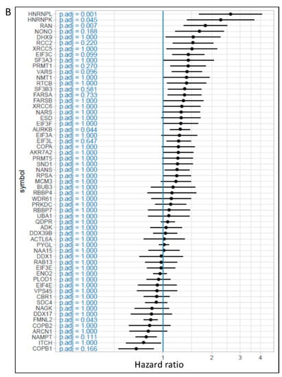 (A) Kaplan–Meyer curves of the survival of melanoma patients expressing high or low amounts of the selected genes (dataset: SKCM-TCGA Skin Cutaneous Melanoma July 2016). The table indicates the p-value, adjusted p-value and the function of the selected genes from Table S1. Low and high expression groups are marked in green and red, respectively. The total patient number for each group is indicated in the top right corner and the number of censoring samples are shown with +. The concordance index (CI) per curve is presented. On the y axis, the probability is represented; on the x axis, the time in days (black) is shown and the number of samples for low (green) and high (red) expression groups who are not presenting the event at the matching time. (B) Forest plot representing hazard ratio and confidence intervals from Cox models for the selected genes (dataset: SKCM-TCGA Skin Cutaneous Melanoma July 2016). Models accounting for stage group effect were run separately on each gene and p-values were adjusted by false discovery rate (also see Section 4).