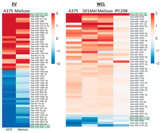 miRNA profiling of melanoma EVs and WCLs. Heatmap showing the top 25 miRNAs differentially up- (red) or downregulated (blue) in A375 and MelJuso hEVs compared to nEVs (left) and regulated miRNAs in hWCLs compared to nWCLs in all four cell lines (right). Colours indicate the fold change in expression relative to normoxia (log2 scale). miRNAs found in both EVs and WCLs are framed in green.