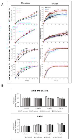 (A) Invasion-migration assays. Melanoma nEVs and hEVs from A375 or 501Mel cells were added to their respective cells of origin or to NHDFs. Migration was monitored for 24h and invasion for 72h. * p < 0.05, ** p < 0.01, *** p < 0.001, compared to control treatment. (B) Proliferation assays. Melanoma nEVs and hEVs (A375 or 501Mel) were added to melanoma cells (A375 or 501Mel) or to NHDFs. Proliferation was monitored 48 h after EV addition.
