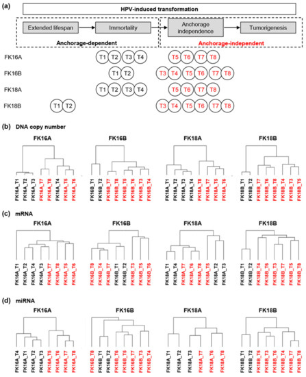Characterization of our longitudinal in vitro model system of human papillomavirus (HPV)-induced transformation. (a) Anchorage-dependent (black) and -independent (red) time points (T) of all four cell lines are shown in relation to the transformation process [16]. MiRNA microarrays of cell line FK18A at T4 and T5 did not pass quality control and were therefore excluded from miRNA analysis. Unsupervised hierarchical cluster results based on (b) DNA copy number, (c) overall mRNA expression, and (d) overall miRNA [16] expression are shown for FK16A, FK16B, FK18A, and FK18B.