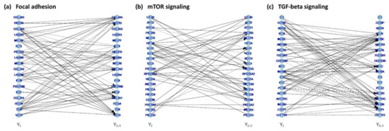 For network enrichment analysis, 118 potentially relevant pathways stored in the KEGG repository were considered (Table S1) [54]. Enrichment analysis showed significant overrepresentation of 21 pathways within the copy number related differentially expressed mRNAs (chi-square test with FDR correction). From these 21 pathways, focal adhesion (KEGG hsa04510), TGF-beta signaling (KEGG hsa04350), and mTOR signaling (KEGG hsa04150) were selected for subsequent pathway reconstruction analysis based on the following criteria: (1) total number of genes in pathway is between 50 and 200 (requirement for downstream pathway reconstruction), (2) more than 5% of genes within the pathway showed copy number induced differential expression. Although the B-cell receptor signaling pathway (hsa04662) and cell cycle (hsa04110) also met these criteria, they were not investigated further. This analysis aimed to identify hub genes, which represent possible key regulators of the pathway in the given context. For this purpose, mRNA gene expression data from the experiment was mapped to the pathways as defined by the KEGG repository and the vector autoregressive model with time-varying DNA copy number was employed [54,55]. This model allows to identify both temporal (signals propagated over time) and contemporaneous (signal propagated among the genes) interactions among the genes. This integrative methodology allows identification of the ‘within-level’ relationship in the mRNA gene levels as well as relations between different molecular levels [55,56].